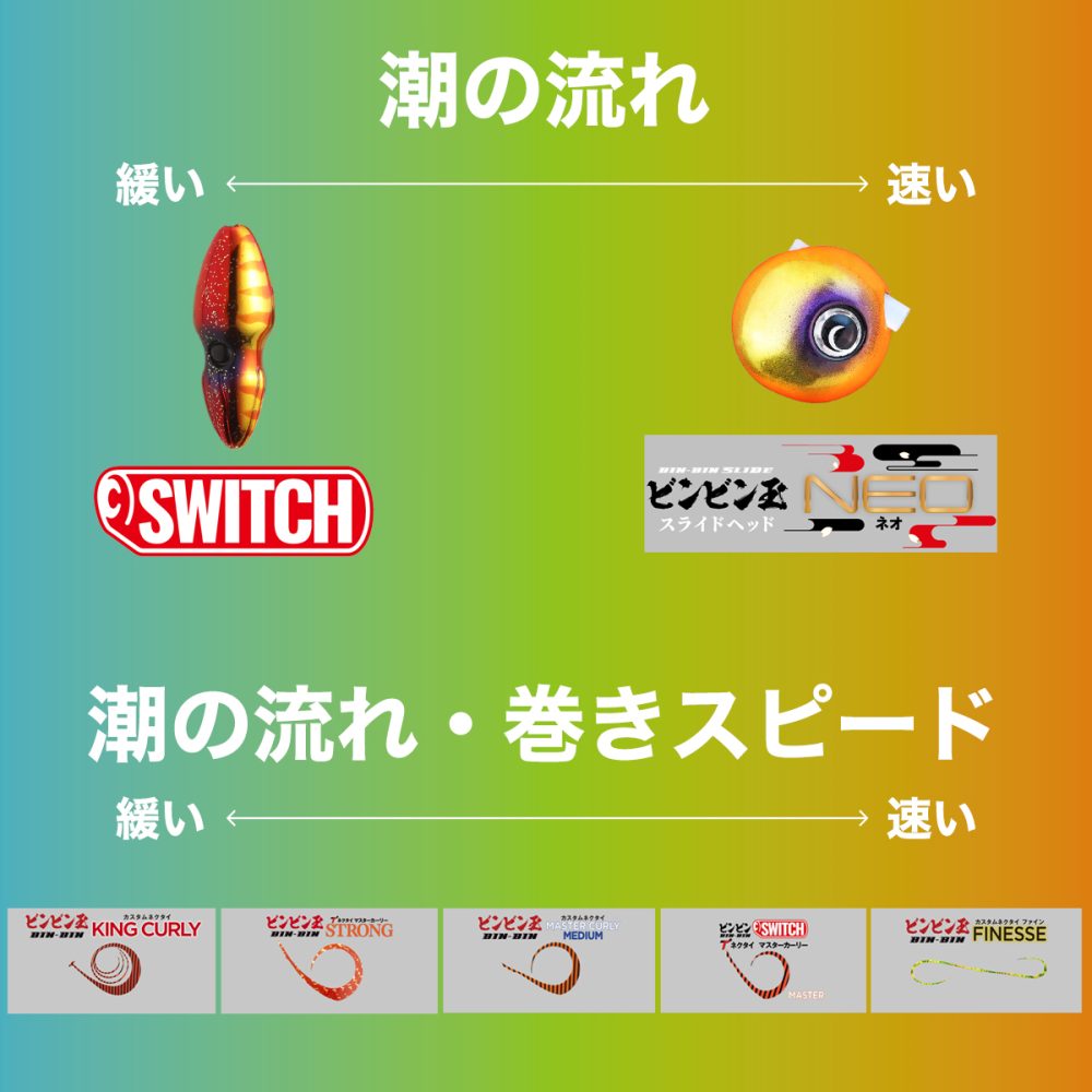 潮の動き始め、止まる前や微風の時ですね。この状態は丸型、ビンビン玉NEOの出番です。水深に対してやや軽めのウエイトで最初の着底点から斜め引きになるようにして丸型が綺麗に泳ぐようにします。ネクタイは中間サイズ・厚み〜大サイズ・厚めをチョイスします。