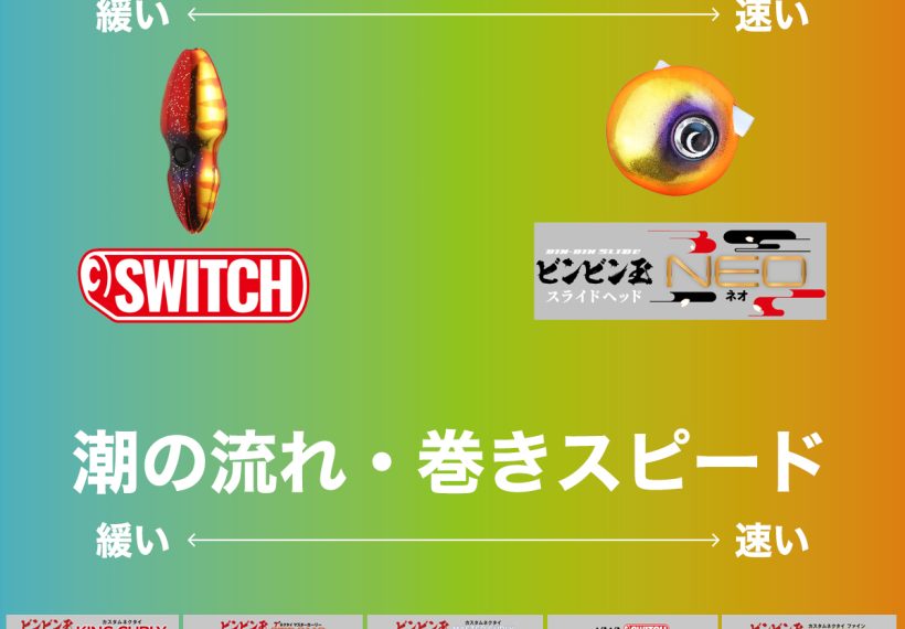 無風の潮なし状態。タイラバは真下に落ちて真上に上がります。この状況はビンビンスイッチの出番です。丸型ヘッドしかない時は、ヘッドを軽くしてフルキャットをし斜め引きで誘っていましたが、ビンビンスイッチが登場したことで解決しました。ネクタイは速く巻くなら薄めでシルエットの小さいもの、スローに巻くなら厚めで大きめのシルエットを使います。