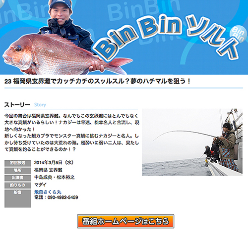 ビンビンソルト「23 福岡県玄界灘でカッチカチのスッルスル?夢のハチマルを狙う!」が2014年3月5日(水)21時初回放送です。