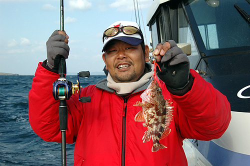 まずは40mラインからスタート。強風と高波ということもあり、私はビンビン玉の60g松本レッドをセレクト。ひと流し目からアタリがあり、フッキングするもすぐにフックアウト。他のメンバーにもアタリはあるもののこのひと流し目に顔を見せたのはアラカブ(ガシラ)とエソのみ。