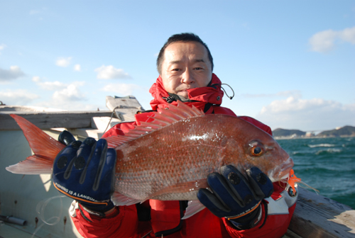 すると隣で釣っていたハッシンのロッドが曲がった! 「チャリコやわ!」と 言いながらリールを巻くと40弱の真鯛でした。